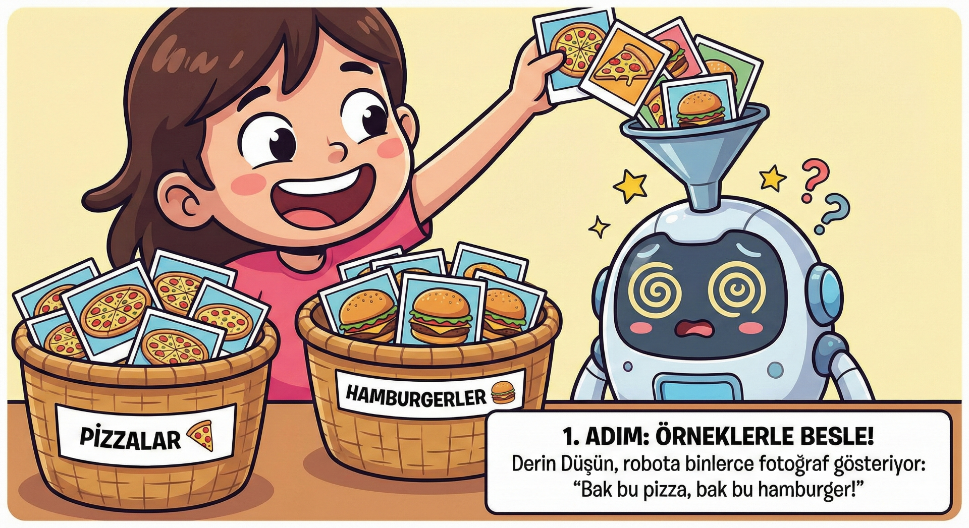 Yapay zekayı, bir bilgisayarın tıpkı bizler gibi öğrenmeyi sevmesi olarak düşünebilirsiniz. Ama o, kitaplar yerine verilerle beslenir! 📚